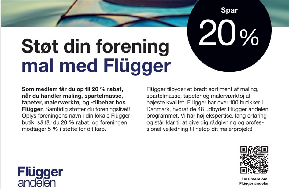 Foreningens medlemmer og familie får 20 % rabat på alt maling, tapet og værktøj hos Flügger, mens 5 % af beløbet opspares som foreningsstøtte.